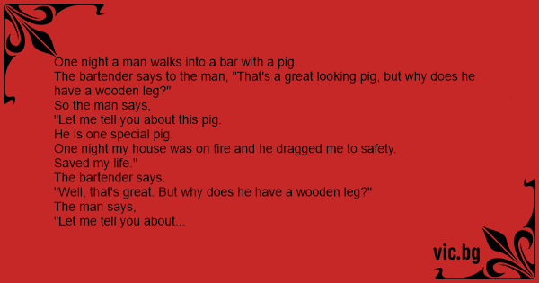The bartender says to the man, "That's a great looking pig, but why does he have a wooden leg?"