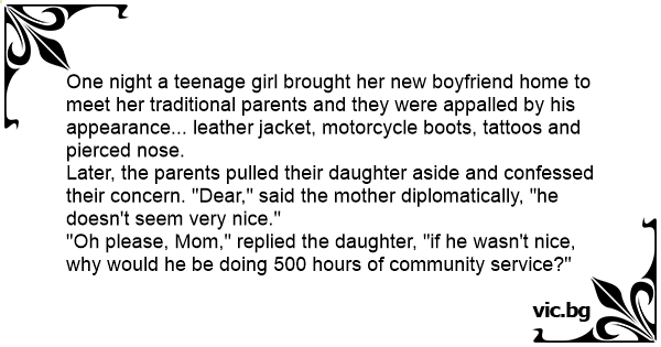 One night a teenage girl brought her new boyfriend home to meet her traditional parents and they were appalled by his appearance... leather jacket, motorcycle boots, tattoos and pierced nose.