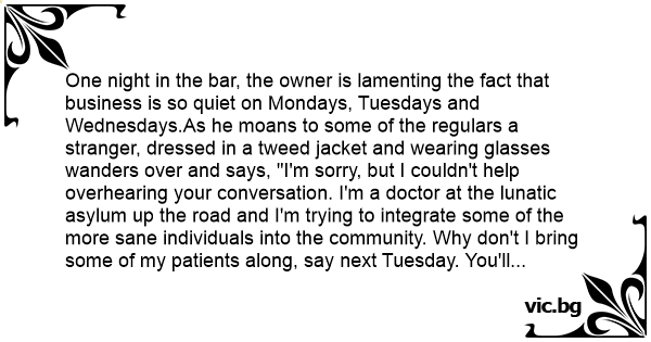 One night in the bar, the owner is lamenting the fact that business is so quiet on Mondays, Tuesdays and Wednesdays.As he moans to some of the regulars a stranger, dressed in a tweed jacket and wearing glasses wanders over and says, "I'm sorry, but I couldn't help overhearing your conversation. I'm a doctor at the lunatic asylum up the road and I'm trying to integrate some of the more sane individuals into the community. Why don't I bring some of my patients along, say next Tuesday. You'll have some customers and my patients will have a night out."Well, the publican isn't sure but the thought of more paying customers on a quiet night appeals, so he agrees.So, the following Tuesday the guy in the tweed jacket and glasses shows up with about ten lunatics.He says to the publican, "They might try to pay for their drinks in unusual ways, please just accept whatever they give you, put it all on a tab and I'll settle up at closing time."The barman has a great time selling loads of drinks and encouraging the loonies to eat сhiрs and peanuts. The loonies have a great time, getting drunк and paying for their drinks with empty Coke cans, banana peels, used tea bags and plastic shopping bags.At closing time the barman adds up the bill and it comes to just over two hundred dollars! The guy with the glasses and the tweed jacket starts to organize the loonies ready to take them back to the asylum. Finally he comes over and asks for the bill. The publican, feeling that he's charged them rather a lot and feeling he should do his bit to help these poor unfortunate people gives him a discount."Let's call It $150," he says.The guy in the tweed jacket smiles and says, "That's fine. Have you got change for a garbage can?"