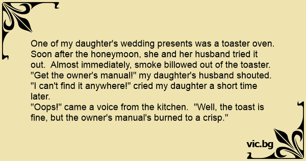 One of my daughter's wedding presents was a toaster oven. Soon after the honeymoon, she and her husband tried it out. Almost immediately, smoke billowed out of the toaster.