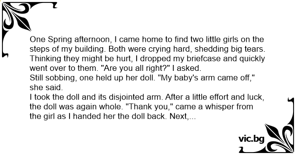 I took the doll and its disjointed arm. After a little effort and luck, the doll was again whole. "Thank you," came a whisper from the girl as I handed her the doll back. Next, looking into the tearful eyes of her friend, I asked,