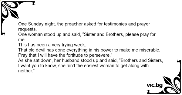 One Sunday night, the preacher asked for testimonies and prayer requests.