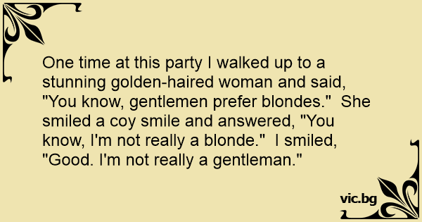 "You know, gentlemen prefer blondes." She smiled a coy smile and answered, "You know, I'm not really a blonde." I smiled, "Good. I'm not really a gentleman."
