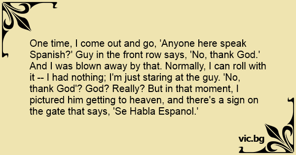 One time, I come out and go, 'Anyone here speak Spanish?' Guy in the front row says, 'No, thank God.' And I was blown away by that. Normally, I can roll with it -- I had nothing; I'm just staring at the guy. 'No, thank God'? God? Really? But in that moment, I pictured him getting to heaven, and there's a sign on the gate that says, 'Se Habla Espanol.'