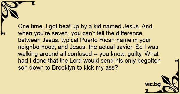 One time, I got beat up by a kid named Jesus. And when you're seven, you can't tell the difference between Jesus, typical Puerto Rican name in your neighborhood, and Jesus, the actual savior. So I was walking around all confused -- you know, guilty. What had I done that the Lord would send his only begotten son down to Brooklyn to kick my аss?