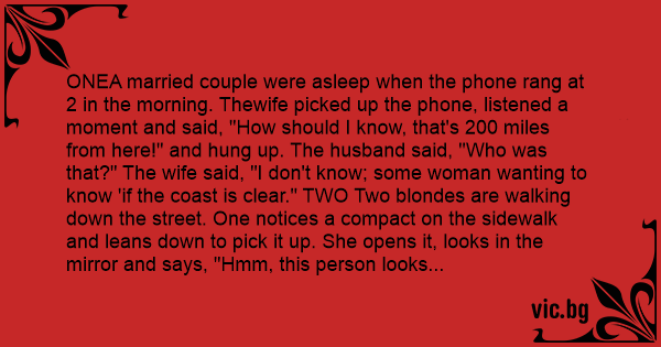 ONEA married couple were asleep when the phone rang at 2 in the morning. Thewife picked up the phone, listened a moment and said, "How should I know, that's 200 miles from here!" and hung up. The husband said, "Who was that?" The wife said, "I don't know; some woman wanting to know 'if the coast is clear." TWO Two blondes are walking down the street. One notices a compact on the sidewalk and leans down to pick it up. She opens it, looks in the mirror and says, "Hmm, this person looks familiar." the second blonde says, "Here, let me see!" So the first blonde hands her the compact. The second one looks in the mirror and says, "You duммy, it's me!" THREE A blonde suspects her boyfriend of cheating on her, so she goes out and buys a gun. She goes to his apartment unexpectedly and when she opens the door she finds him in the arms of a redhead. Well, the blonde is really angry. She opens her purse to take out the gun, and as she does so, she is overcome with grief. She takes the gun and puts it to her head. The boyfriend yells, "No, honey, don't do it." The blonde replies, "Shut up, you're next!"FOUR A blonde was bragging about her knowledge of state capitals. She proudly says, "Go ahead, ask me, I know all of them." A friend says, "OK, what's the capital of Wisconsin?" The blonde replies, "Oh, that's easy: W." FIVE What did the blonde ask her doctor when he told her she was pregnant? "Is it mine?" SIX A blonde had just totaled her car in a horrific accident. Miraculously, she managed to pry herself from the wreckage without a scratch and was applying fresh lipstick when the state trooper arrived. "My God!" the trooper gasped. "Your car looks like an accordion that was stomped on by an elephant. Are you OK ma'am?"
