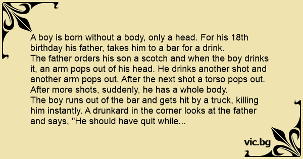 A boy is born without a body, only a head. For his 18th birthday his father, takes him to a bar for a drink.