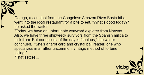 Oomga, a cannibal from the Congolese Amazon River Basin tribe went into the local restaurant for a bite to eat. "What's good today?" he asked the waiter.