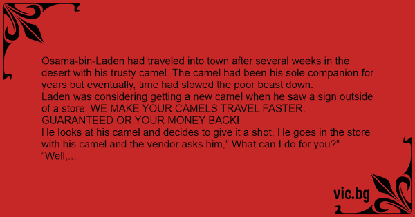 Laden was considering getting a new camel when he saw a sign outside of a store: WE MAKE YOUR CAMELS TRAVEL FASTER. GUARANTEED OR YOUR MONEY BACK!