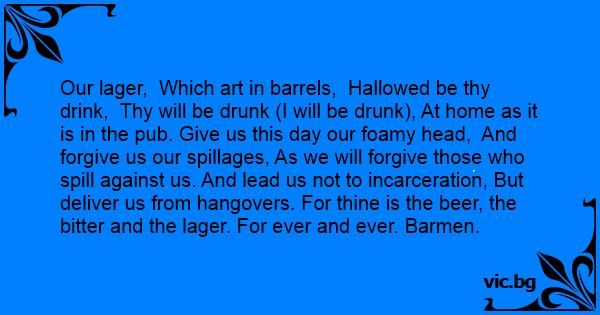 Our lager, Which art in barrels, Hallowed be thy drink, Thy will be drunк (I will be drunк), At home as it is in the pub. Give us this day our foamy head, And forgive us our spillages, As we will forgive those who spill against us. And lead us not to incarceration, But deliver us from hangovers. For thine is the вееr, the bitter and the lager. For ever and ever. Barmen.