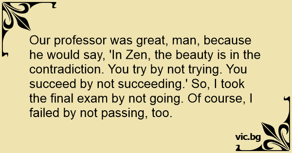 Our professor was great, man, because he would say, 'In Zen, the beauty is in the contradiction. You try by not trying. You succeed by not succeeding.' So, I took the final exam by not going. Of course, I failed by not passing, too.