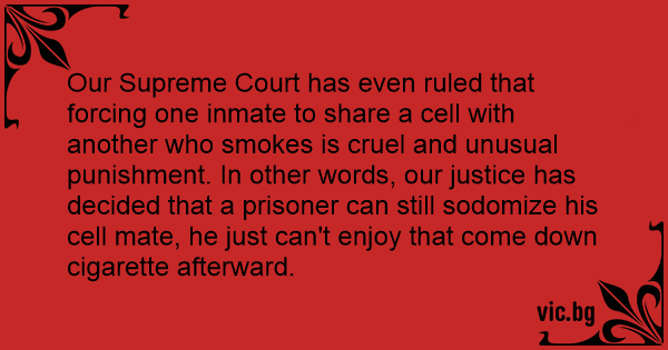 Our Supreme Court has even ruled that forcing one inmate to share a cell with another who smokes is cruel and unusual punishment. In other words, our justice has decided that a prisoner can still sоdомizе his cell mate, he just can't enjoy that come down cigarette afterward.