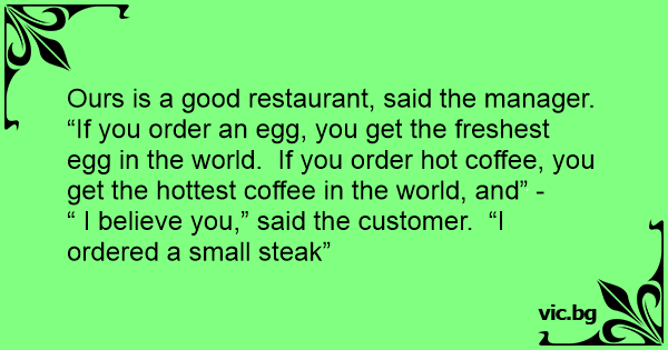 “ I believe you,” said the customer. “I ordered a small steak”