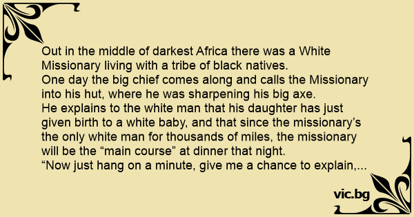 На вожда на африканско племе му се ражда бяло дете. Вика той белия мисионер и му вика: