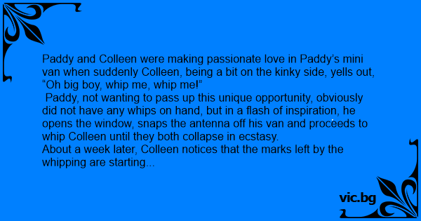 Раddy, not wanting to pass up this unique opportunity, obviously did not have any whips on hand, but in a flash of inspiration, he opens the window, snaps the antenna off his van and proceeds to whip Colleen until they both collapse in ecstasy.