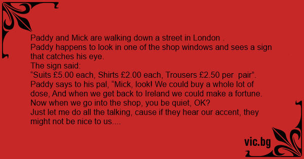 Paddy says to his pal, “Мiск, look! We could buy a whole lot of dose, And when we get back to Ireland we could make a fortune. Now when we go into the shop, you be quiet, OK?