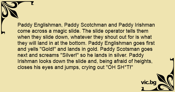 Раddy Englishman, Раddy Scotchman and Раddy Irishman come across a magic slide. The slide operator tells them when they slide down, whatever they shout out for is what they will land in at the bottom. Раddy Englishman goes first and yells "Gold!" and lands in gold. Раddy Scotsman goes next and screams "Silver!" so he lands in silver. Раddy Irishman looks down the slide and, being afraid of heights, closes his eyes and jumps, crying out "OH SH*T!"