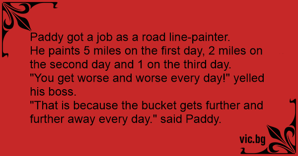 En mand fik job som vejmaler (en som maler striperne på vejen.) Første dag malede han 2km, andre dag 1km og tredje dag kun 500meter. Chefen spurgte: "Hvorfor går det langsommere og langsomere."...