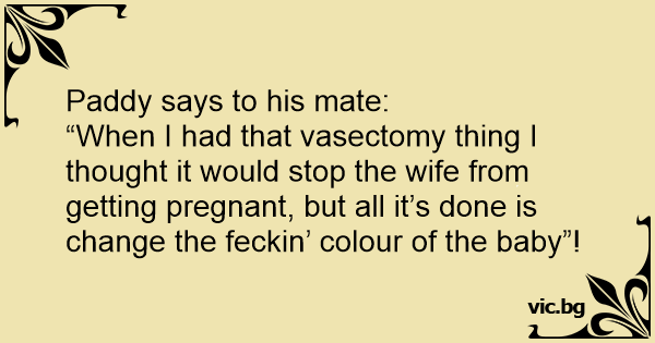 “When I had that vasectomy thing I thought it would stop the wife from getting pregnant, but all it’s done is change the feckin’ colour of the baby”!