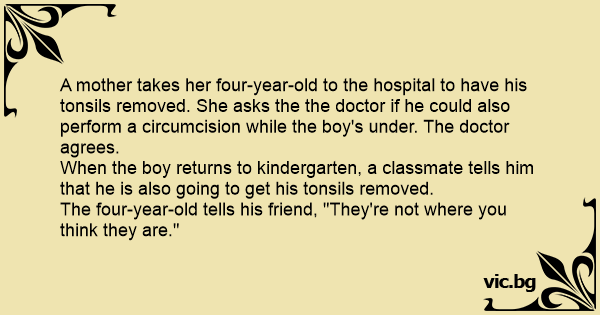 A mother takes her four-year-old to the hospital to have his tonsils removed. She asks the the doctor if he could also perform a circumcision while the boy's under. The doctor agrees.