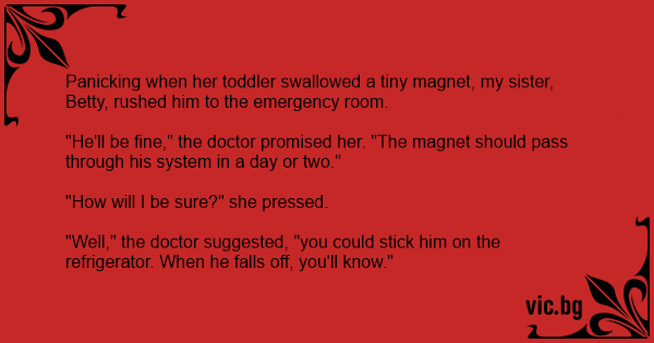 "He'll be fine," the doctor promised her. "The magnet should pass through his system in a day or two."