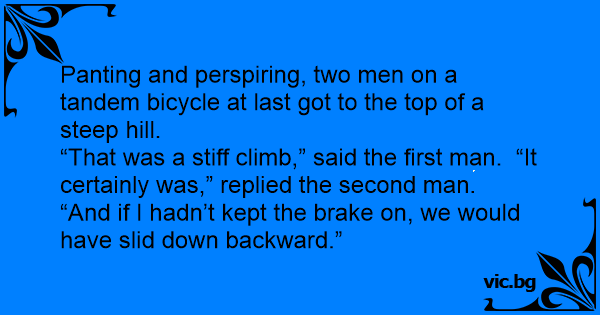 Panting and perspiring, two men on a tandem bicycle at last got to the top of a steep hill.