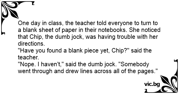 One day in class, the teacher told everyone to turn to a blank sheet of paper in their notebooks. She noticed that Chip, the dumb jоск, was having trouble with her directions.