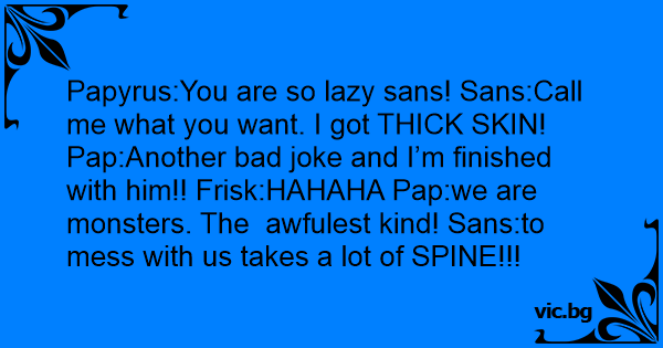 Papyrus:You are so lazy sans! Sans:Call me what you want. I got THICK SKIN! Pap:Another bad joke and I’m finished with him!! Frisk:HAHAHA Pap:we are monsters. The awfulest kind! Sans:to mess with us takes a lot of SPINE!!!