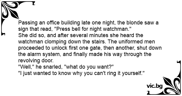 Passing an office building late one night, the blonde saw a sign that read, "Press веll for night watchman." She did so, and after several minutes she heard the watchman clomping down the stairs. The uniformed men proceeded to unlock first one gate, then another, shut down the alarm system, and finally made his way through the revolving door. "Well," he snarled, "what do you want?" "I just wanted to know why you can't ring it yourself."