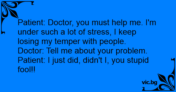 Patient: Doctor, you must help me. I'm under such a lot of stress, I keep losing my temper with people.