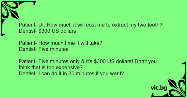 Пацієнт на прийомі у стоматолога: — Лікарю, скажіть, скільки коштує у Вас видалити зуб? — П'ятдесят доларів. — Три хвилини і п'ятдесят баксів ?! — Добре, добре, я буду висмикувати Ваш зуб три години!