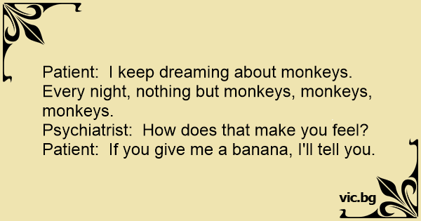 Patient: I keep dreaming about monkeys. Every night, nothing but monkeys, monkeys, monkeys.