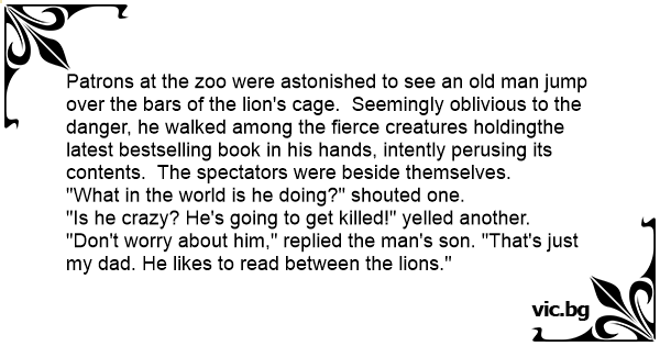 "Don't worry about him," replied the man's son. "That's just my dad. He likes to read between the lions."