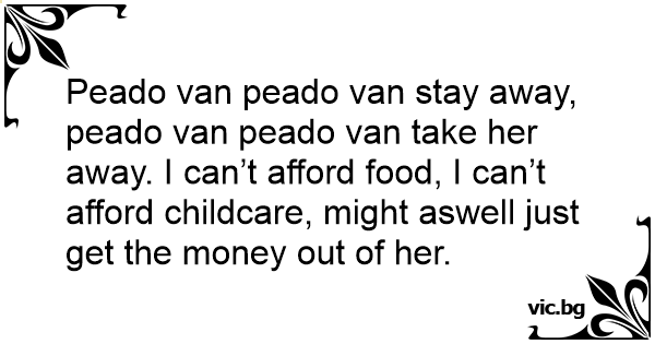 Peado van peado van stay away, peado van peado van take her away. I can’t afford food, I can’t afford childcare, might aswell just get the money out of her.