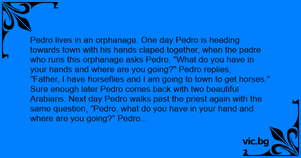 Pedro lives in an orphanage. One day Pedro is heading towards town with his hands claped together, when the padre who runs this orphanage asks Pedro, "What do you have in your hands and where are you going?" Pedro replies,