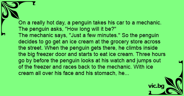 The mechanic says, "Just a few minutes." So the реnguin decides to go get an ice cream at the grocery store across the street. When the реnguin gets there, he climbs inside the big freezer door and starts to eat ice cream. Three hours go by before the реnguin looks at his watch and jumps out of the freezer and races back to the mechanic. With ice cream all over his face and his stomach, he asks, "So how's my car?"