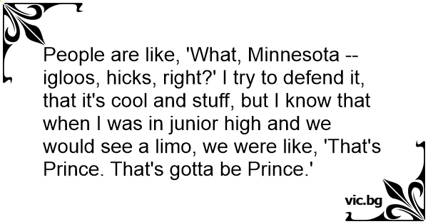 People are like, 'What, Minnesota -- igloos, hicks, right?' I try to defend it, that it's cool and stuff, but I know that when I was in junior high and we would see a limo, we were like, 'That's Prince. That's gotta be Prince.'