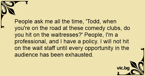 People ask me all the time, 'Todd, when you're on the road at these comedy clubs, do you hit on the waitresses?' People, I'm a professional, and I have a policy. I will not hit on the wait staff until every opportunity in the audience has been exhausted.