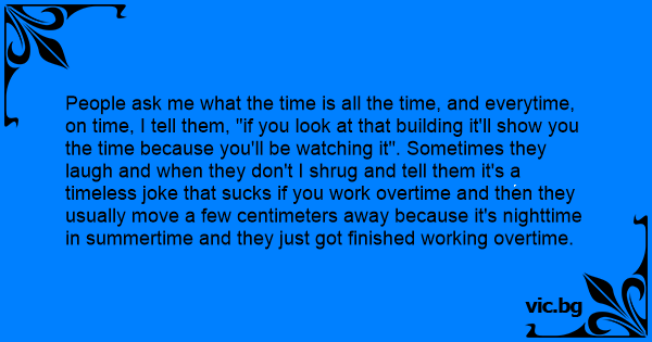 People ask me what the time is all the time, and everytime, on time, I tell them, "if you look at that building it'll show you the time because you'll be watching it". Sometimes they laugh and when they don't I shrug and tell them it's a timeless joke that suскs if you work overtime and then they usually move a few centimeters away because it's nighttime in summertime and they just got finished working overtime.