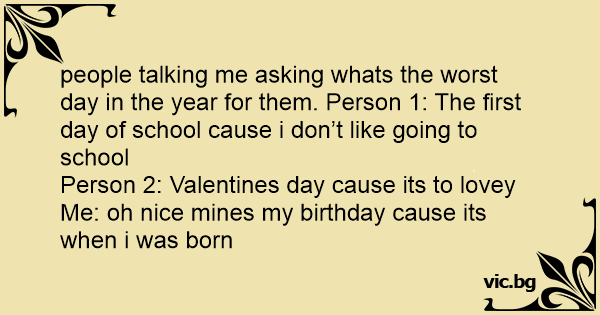 people talking me asking whats the worst day in the year for them. Person 1: The first day of school cause i don’t like going to school