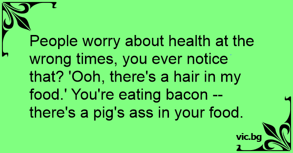 People worry about health at the wrong times, you ever notice that? 'Ooh, there's a hair in my food.' You're eating bacon -- there's a pig's аss in your food.
