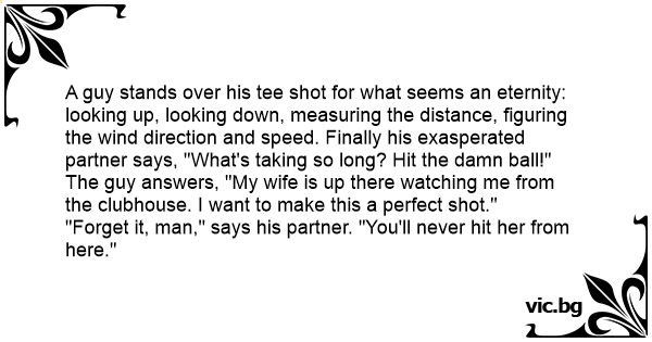 A guy stands over his tee shot for what seems an eternity: looking up, looking down, measuring the distance, figuring the wind direction and speed. Finally his exasperated partner says, "What's taking so long? Hit the dамn ball!"
