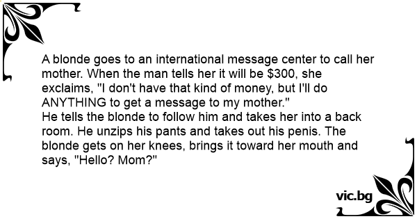 A blonde goes to an international message center to call her mother. When the man tells her it will be $300, she exclaims, "I don't have that kind of money, but I'll do ANYTHING to get a message to my mother."