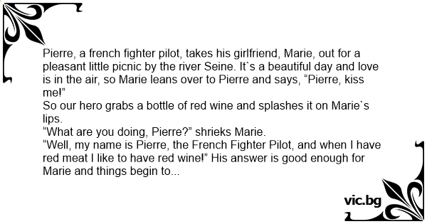 Pierre, a french fighter pilot, takes his girlfriend, Marie, out for a pleasant little picnic by the river Seine. It`s a beautiful day and love is in the air, so Marie leans over to Pierre and says, “Pierre, kiss me!”