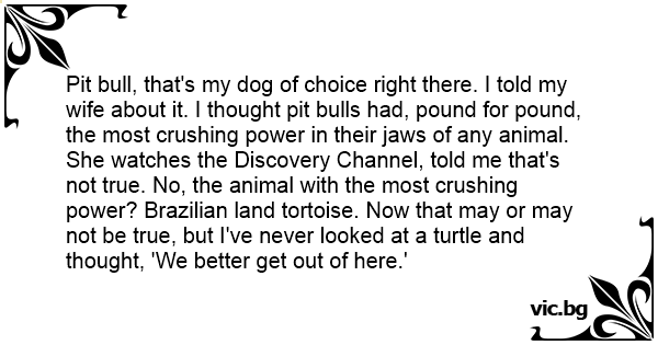 Pit bull, that's my dog of choice right there. I told my wife about it. I thought pit bulls had, pound for pound, the most crushing power in their jaws of any animal. She watches the Discovery Channel, told me that's not true. No, the animal with the most crushing power? Brazilian land tortoise. Now that may or may not be true, but I've never looked at a turtle and thought, 'We better get out of here.'
