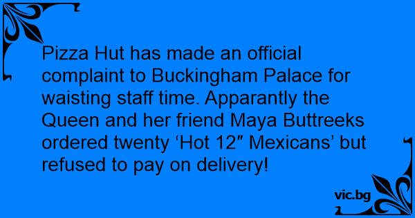 Pizza Hut has made an official complaint to Buckingham Palace for waisting staff time. Apparantly the Queen and her friend Maya Buttreeks ordered twenty ‘Hot 12″ Mexicans’ but refused to pay on delivery!