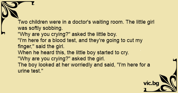 Сидить маленька дівчинка в лікарні й плаче. Підходить до неї хлопчик: — Чому ти плачеш? — Я прийшла робити аналіз крові й мені палець відріжуть. Хлопчик заплакав ще сильніше за дівчинку. — А ти чому плачеш? — запитала дівчинка. — А я прийшов аналіз сечі здавати…