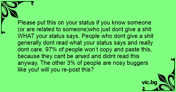 Please put this on your status if you know someone (or are related to someone)who just dont give a shiт WHAT your status says. People who dont give a shiт generally dont read what your status says and really dont care. 97% of people won’t copy and paste this, because they cant be arsed and didnt read this anyway. The other 3% of people are nosy buggers like you! will you re-post this?