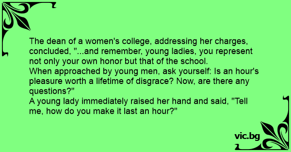 A young lady immediately raised her hand and said, "Tell me, how do you make it last an hour?"