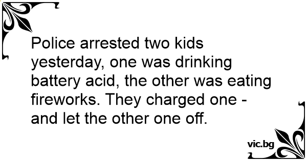 Police arrested two kids yesterday, one was drinking battery acid, the other was eating fireworks. They charged one - and let the other one off.